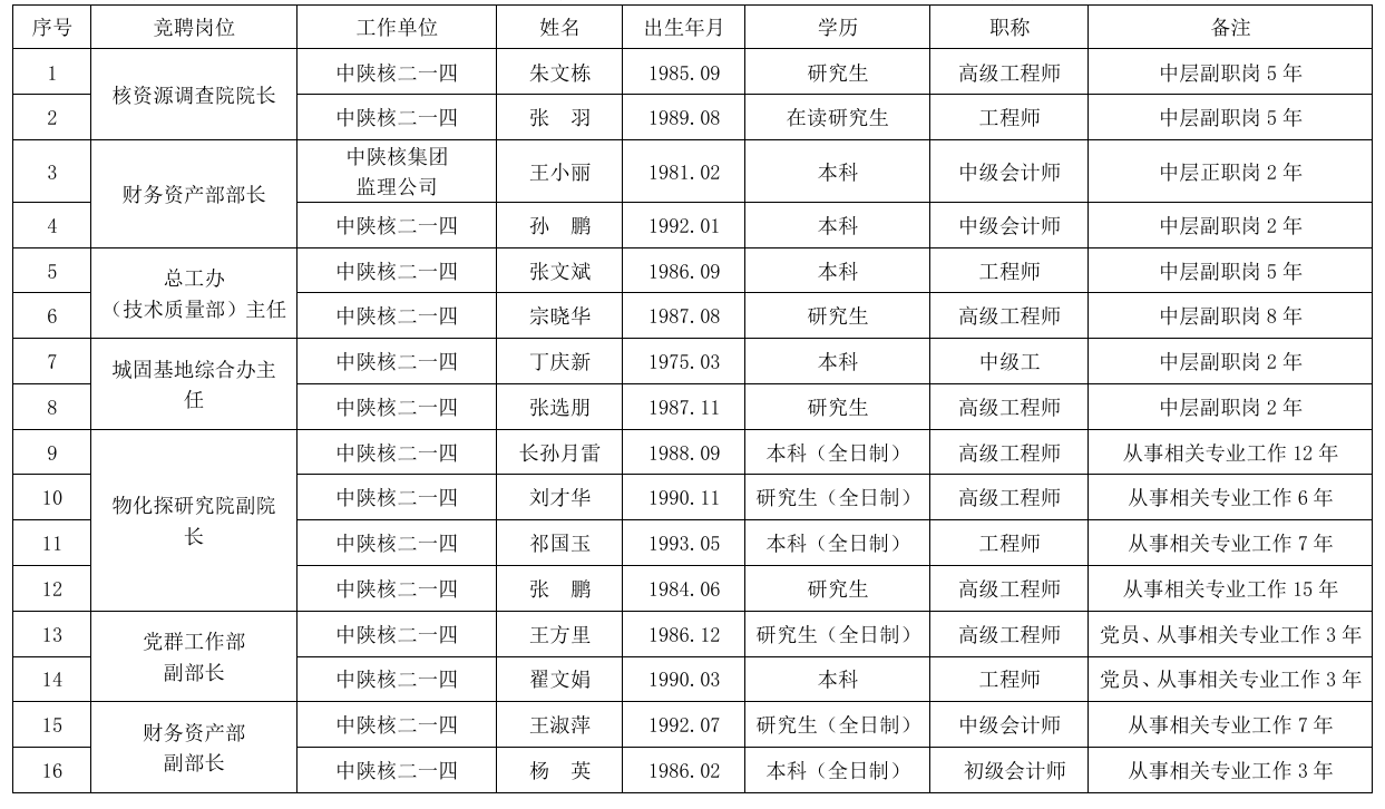 根據(jù)中陜核工業(yè)集團(tuán)二一四大隊(duì)有限公司《中層管理人員選聘工作方案》有關(guān)要求,現(xiàn)對(duì)資格審查通過的報(bào)名人員予以公示: