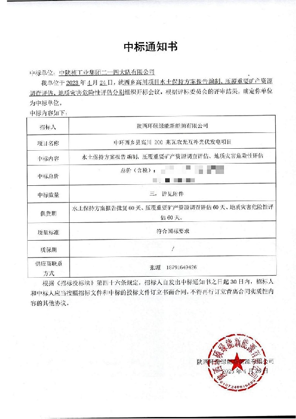 4月28日,接中標(biāo)通知,中陜核工業(yè)集團(tuán)二一四大隊(duì)有限公司水工環(huán)調(diào)查院在公開(kāi)招標(biāo)的“中環(huán)西鄉(xiāng)縣高川200MW農(nóng)光互補(bǔ)光伏發(fā)電項(xiàng)目”中成功競(jìng)標(biāo)勝出,一舉中標(biāo)該項(xiàng)目的水土保持方案、壓覆重要礦產(chǎn)資源調(diào)查和地質(zhì)災(zāi)害危險(xiǎn)性評(píng)估三項(xiàng)技術(shù)服務(wù)工作。