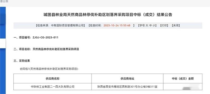 10月24日,據陜西省政府采購網公告,公司成功中標《城固縣林業局天然商品林停伐補助區劃落界項目》。