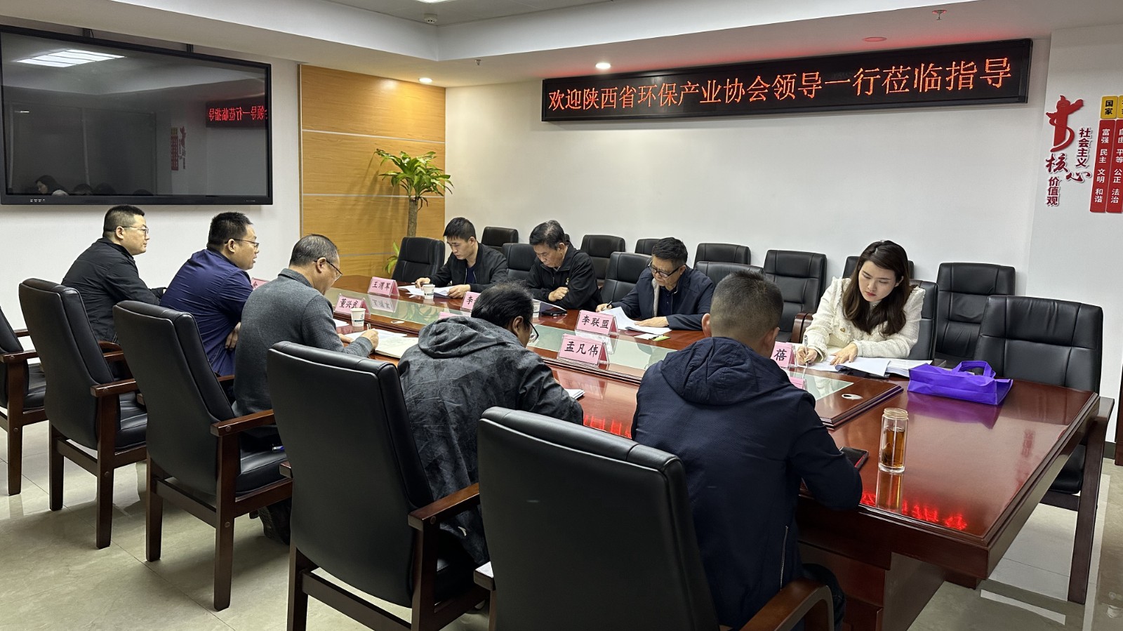 陜西省環保協會高級顧問李聯盟、副秘書長王渭軍、會員部主任樊蓓,公司經發部、行政部、水工環院負責人參加座談。