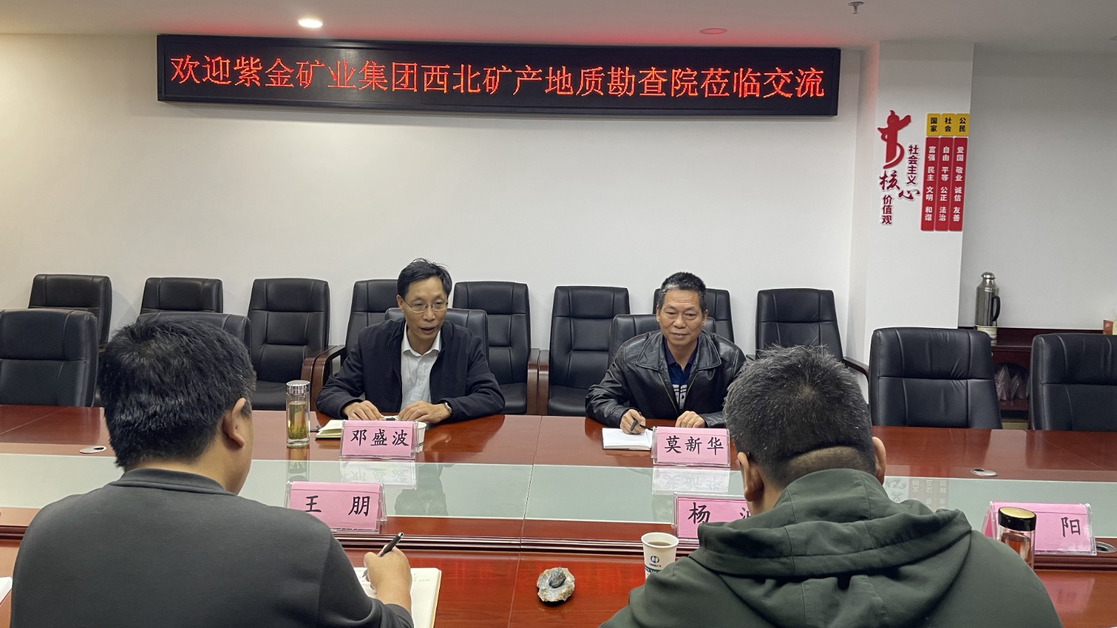 11月4日,紫金礦業集團西北礦產地質勘查院院長莫新華一行蒞臨公司考察交流。公司黨委書記、董事長鄧盛波參加座談。