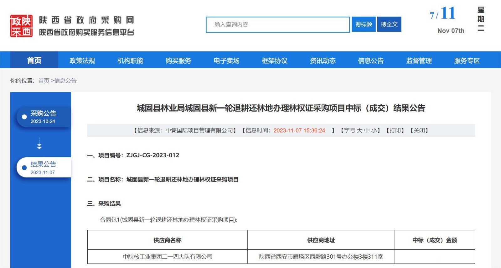 11月7日,據(jù)陜西省政府采購網(wǎng)公告,公司成功中標《城固縣新一輪退耕還林地辦理林權(quán)證采購項目》。