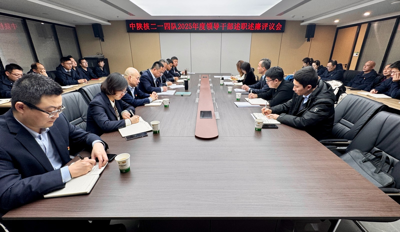 按照中陜核集團黨委統一部署,12月30日下午,中陜核二一四隊召開了2025年度領導干部述職述廉評議會,集團公司黨委副書記馮凱出席會議并講話,會議由集團黨委工作部副部長治蕾主持。集團公司第四考核組成員、公司領導班子成員、中層正職及部分職工代表參加會議。