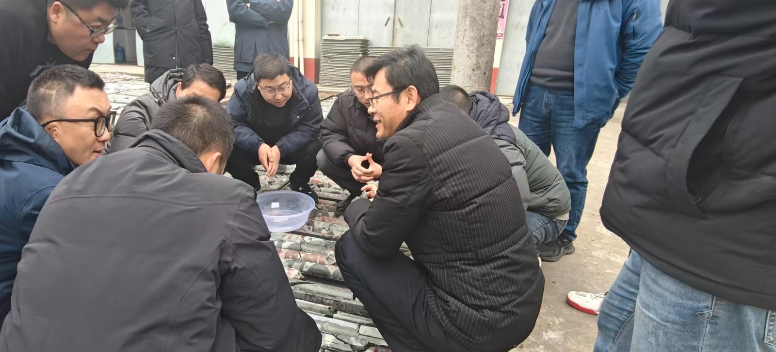 郭科鋒一行首先聽取了項目負責人關于西鄉縣蔡家梁金礦詳查項目整體開展情況、關鍵節點實施進度及階段性找礦成果的系統匯報,隨后細致檢查了探礦工程原始編錄資料和巖心,對于項目組工作成績給予了充分肯定。同時針對項目后續推進,提出了明確要求:一是深化地質綜合研究,通過多維度對比佐證已有勘查成果,精準總結成礦富集規律,為深部找礦提供科學理論支撐;二是聚焦“明金效應”找礦難題,加快開展專題研究,進一步理清找礦思路與方向,為項目全面轉入詳查階段筑牢堅實基礎;三是強化協同聯動,凝聚集團與各級單位合力,精準破解項目推進中的疑點、難點,為找礦突破注入強勁動力。最后,郭科鋒重點強調,安全生產是項目發展的生命線,必須堅守安全生產底線,切實抓好鉆機冬季施工安全管理、消防安全防控等關鍵環節,提前統籌部署野外隊伍收隊安排、資料整理等工作,確保項目推進安全有序、成果扎實可靠。