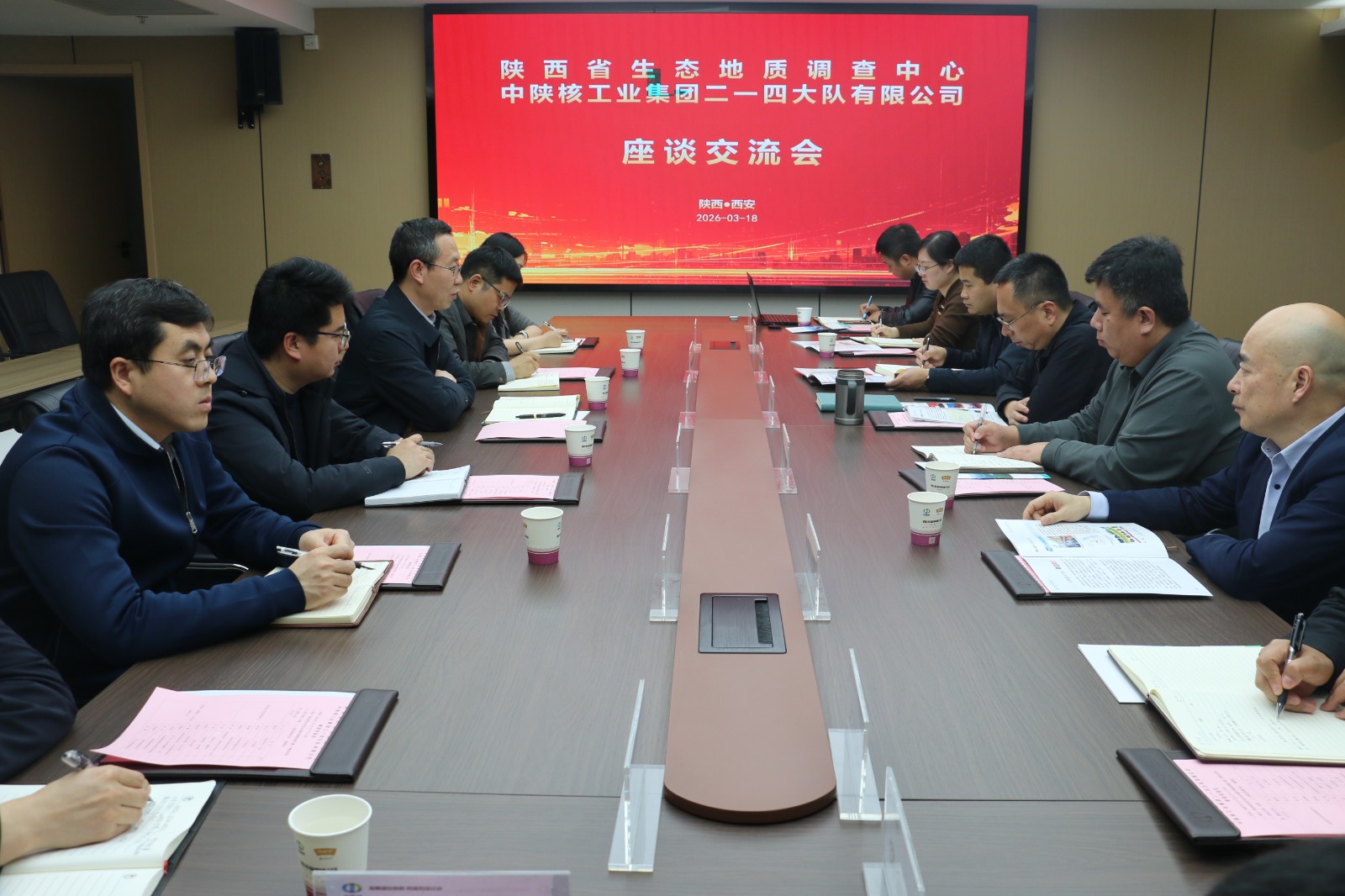 3月18日下午,陜西省生態(tài)地質(zhì)調(diào)查中心與中陜核工業(yè)集團(tuán)二一四大隊有限公司開展專題調(diào)研座談會,聚焦生態(tài)地質(zhì)技術(shù)創(chuàng)新、項目協(xié)同推進(jìn)、成果轉(zhuǎn)化應(yīng)用等重點(diǎn)議題深入交流。省生態(tài)地質(zhì)調(diào)查中心黨總支書記、主任薛旭平,總工程師何元方;二一四隊黨委書記、董事長付星,黨委委員、總經(jīng)理王朋參加會議。
