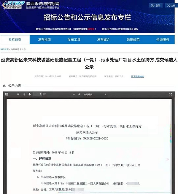 9月8日,通過(guò)陜西采購(gòu)與招標(biāo)網(wǎng)公示信息獲悉,公司參與競(jìng)爭(zhēng)性磋商的“延安高新區(qū)未來(lái)科技城基礎(chǔ)設(shè)施配套工程(一期)-污水處理廠項(xiàng)目水土保持方案”,經(jīng)評(píng)標(biāo)小組專家審定,被確定為第一中標(biāo)候選人。