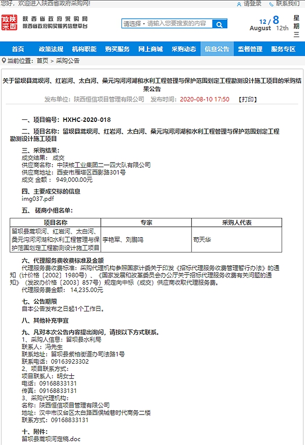 8月10日,從陜西省政府采購網(wǎng)獲悉,公司成功中標“留壩縣蒿壩河、紅巖河、太白河、桑元溝河河湖和水利工程管理與保護范圍劃定工程勘測設計施工項目”。