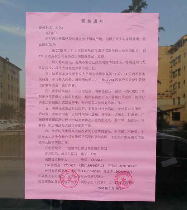 1月30日,中陜核工業(yè)集團(tuán)二一四大隊(duì)有限公司新型冠狀病毒感染的肺炎疫情防控工作領(lǐng)導(dǎo)小組在城固基地組織召開(kāi)了疫情防控工作領(lǐng)導(dǎo)小組會(huì)議,與二一四社區(qū)居委會(huì)、陜健醫(yī)二一四醫(yī)院三方共同對(duì)當(dāng)前防疫工作進(jìn)行了再安排再部署。
