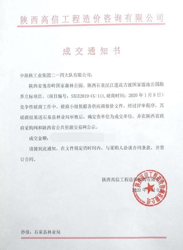 2020年1月9日,從陜西省政府采購網獲悉,公司成功中標“陜西省鬼谷嶺國家森林公園、陜西石泉漢江蓮花古渡國家濕地公園勘界立標項目”。
